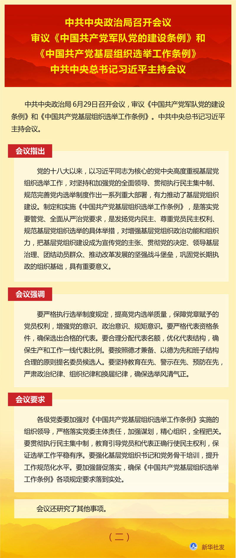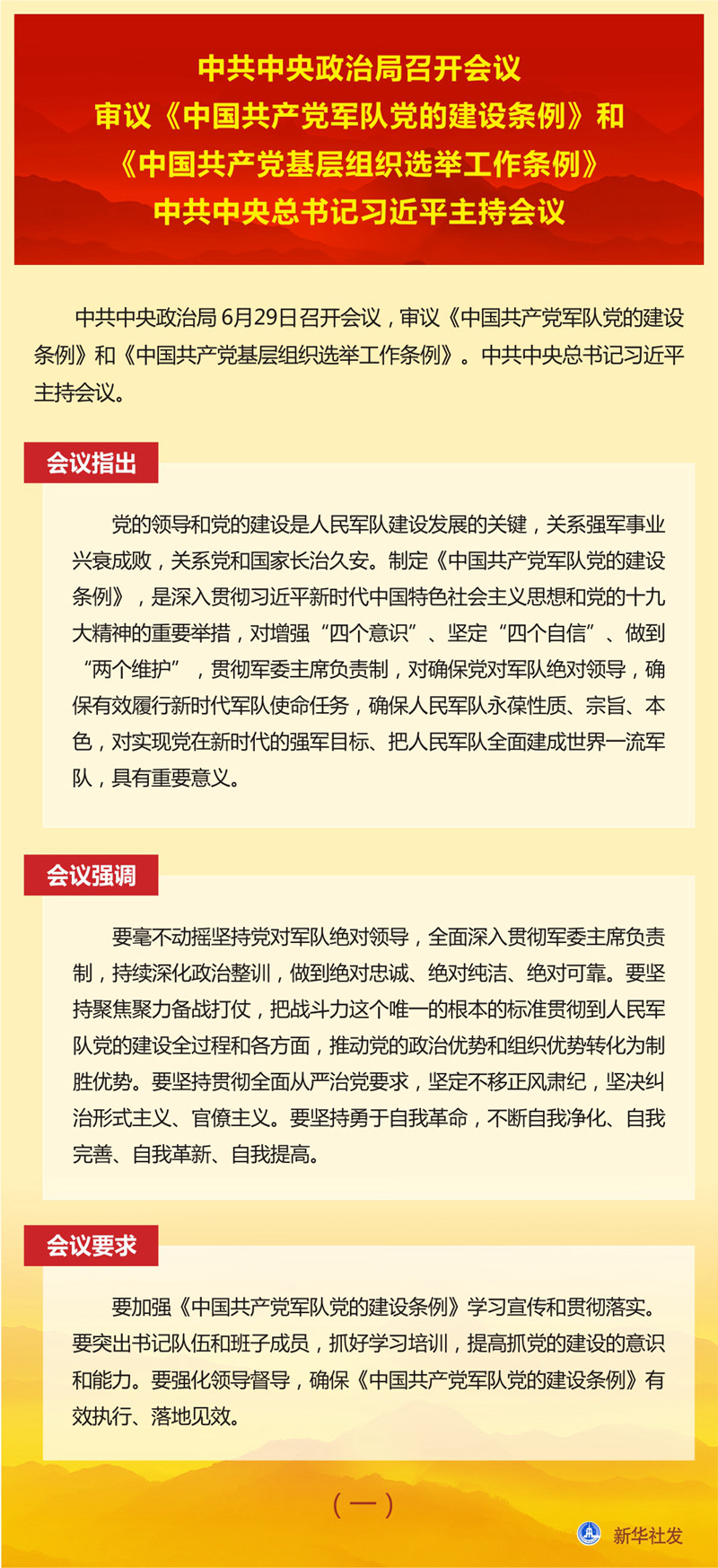 中共中央政治局召開會議 審議《中國共產(chǎn)黨軍隊黨的建設(shè)條例》和《中國共產(chǎn)黨基層組織選舉工作條例》 中共中央總書記習(xí)近平主持會議 新華社北京6月29日電 中共中央政治局6月29日召開會議,審議《中國共產(chǎn)黨軍隊黨的建設(shè)條例》和《中國共產(chǎn)黨基層組織選舉工作條例》。中共中央總書記習(xí)近平主持會議。 會議指出,黨的領(lǐng)導(dǎo)和黨的建設(shè)是人民軍隊建設(shè)發(fā)展的關(guān)鍵,關(guān)系強軍事業(yè)興衰成敗,關(guān)系黨和國家長治久安。制定《中國共產(chǎn)黨軍隊黨的建設(shè)條例》,是深入貫徹習(xí)近平新時代中國特色社會主義思想和黨的十九大精神的重要舉措,對增強“四個意識”、堅定“四個自信”、做到“兩個維護”,貫徹軍委主席負責(zé)制,對確保黨對軍隊絕對領(lǐng)導(dǎo),確保有效履行新時代軍隊使命任務(wù),確保人民軍隊永葆性質(zhì)、宗旨、本色,對實現(xiàn)黨在新時代的強軍目標(biāo)、把人民軍隊全面建成世界一流軍隊,具有重要意義。 會議強調(diào),要毫不動搖堅持黨對軍隊絕對領(lǐng)導(dǎo),全面深入貫徹軍委主席負責(zé)制,持續(xù)深化政治整訓(xùn),做到絕對忠誠、絕對純潔、絕對可靠。要堅持聚焦聚力備戰(zhàn)打仗,把戰(zhàn)斗力這個唯一的根本的標(biāo)準(zhǔn)貫徹到人民軍隊黨的建設(shè)全過程和各方面,推動黨的政治優(yōu)勢和組織優(yōu)勢轉(zhuǎn)化為制勝優(yōu)勢。要堅持貫徹全面從嚴(yán)治黨要求,堅定不移正風(fēng)肅紀(jì),堅決糾治形式主義、官僚主義。要堅持勇于自我革命,不斷自我凈化、自我完善、自我革新、自我提高。 會議要求,要加強《中國共產(chǎn)黨軍隊黨的建設(shè)條例》學(xué)習(xí)宣傳和貫徹落實。要突出書記隊伍和班子成員,抓好學(xué)習(xí)培訓(xùn),提高抓黨的建設(shè)的意識和能力。要強化領(lǐng)導(dǎo)督導(dǎo),確保《中國共產(chǎn)黨軍隊黨的建設(shè)條例》有效執(zhí)行、落地見效。 會議指出,黨的十八大以來,以習(xí)近平同志為核心的黨中央高度重視基層黨組織選舉工作,對堅持和加強黨的全面領(lǐng)導(dǎo)、貫徹執(zhí)行民主集中制、規(guī)范完善黨內(nèi)選舉制度作出一系列重大部署,有力推動了基層黨組織建設(shè)。制定和實施《中國共產(chǎn)黨基層組織選舉工作條例》,是落實黨要管黨、全面從嚴(yán)治黨要求,是發(fā)揚黨內(nèi)民主、尊重黨員民主權(quán)利、規(guī)范基層黨組織選舉的具體舉措,對增強基層黨組織政治功能和組織力,把基層黨組織建設(shè)成為宣傳黨的主張、貫徹黨的決定、領(lǐng)導(dǎo)基層治理、團結(jié)動員群眾、推動改革發(fā)展的堅強戰(zhàn)斗堡壘,鞏固黨長期執(zhí)政的組織基礎(chǔ),具有重要意義。 會議強調(diào),要嚴(yán)格執(zhí)行選舉制度規(guī)定,提高黨內(nèi)選舉質(zhì)量,保障黨章賦予的黨員權(quán)利,增強黨的意識、政治意識、規(guī)矩意識。要嚴(yán)格代表資格條件,確保選出合格的代表。要合理分配代表名額,優(yōu)化代表結(jié)構(gòu),確保生產(chǎn)和工作一線代表比例。要按照德才兼?zhèn)洹⒁缘聻橄群桶嘧咏Y(jié)構(gòu)合理的原則提名委員候選人。要堅持教育在先、警示在先、預(yù)防在先,嚴(yán)肅政治紀(jì)律、組織紀(jì)律和換屆紀(jì)律,確保選舉風(fēng)清氣正。 會議要求,各級黨委要加強對《中國共產(chǎn)黨基層組織選舉工作條例》實施的組織領(lǐng)導(dǎo),嚴(yán)格落實黨委主體責(zé)任,加強謀劃,精心組織,全程把關(guān)。要貫徹執(zhí)行民主集中制,教育引導(dǎo)黨員和代表正確行使民主權(quán)利,保證選舉工作平穩(wěn)有序。要強化基層黨組織書記和黨務(wù)骨干培訓(xùn),提升工作規(guī)范化水平。要加強督促落實,確?!吨袊伯a(chǎn)黨基層組織選舉工作條例》各項規(guī)定要求落到實處。 會議還研究了其他事項。  |