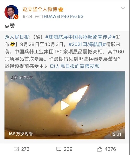 人民日?qǐng)?bào)、新華社、中國(guó)日?qǐng)?bào)、共青團(tuán)中央、國(guó)資小新、騰訊軍事、鳳凰軍事、新浪軍事等新媒體發(fā)布的集團(tuán)公司航展宣傳片等視頻作品燃爆全網(wǎng),閱讀量突破三千萬(wàn)人次,得到外交部發(fā)言人趙立堅(jiān)轉(zhuǎn)載點(diǎn)贊。集團(tuán)公司微信、微博、抖音號(hào)、微信視頻號(hào)等新媒體宣傳片播放閱讀量超過(guò)400萬(wàn)人次。同時(shí),央視新聞、新華社、中國(guó)之聲、央視軍事、央視新媒體、解放軍報(bào)、共青團(tuán)中央、國(guó)資小新、環(huán)球時(shí)報(bào)等多家媒體對(duì)集團(tuán)公司靜、動(dòng)態(tài)展區(qū)進(jìn)行現(xiàn)場(chǎng)直播,在電視端、客戶端、微信視頻號(hào)、微博、B站、快手、抖音等平臺(tái)受到高度關(guān)注。著名軍事專家杜文龍、央視主持人顧國(guó)寧、央廣中國(guó)之聲主持人王藝等直播兵器館、動(dòng)態(tài)表演區(qū)裝備。