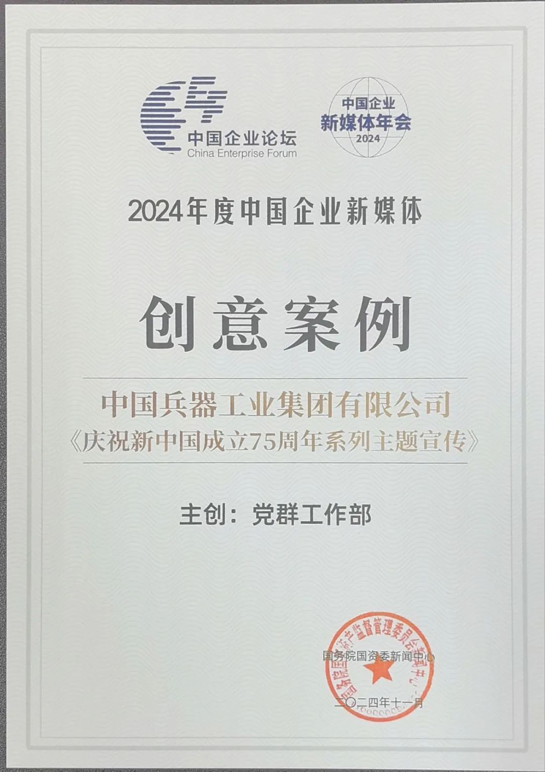 中國企業(yè)新媒體年會現(xiàn)場發(fā)布了“2024年度中國企業(yè)新媒體創(chuàng)新獎、創(chuàng)意獎、創(chuàng)作獎”,其中,集團(tuán)公司《慶祝新中國成立75周年系列主題宣傳》榮獲2024年度中國企業(yè)新媒體創(chuàng)意案例。