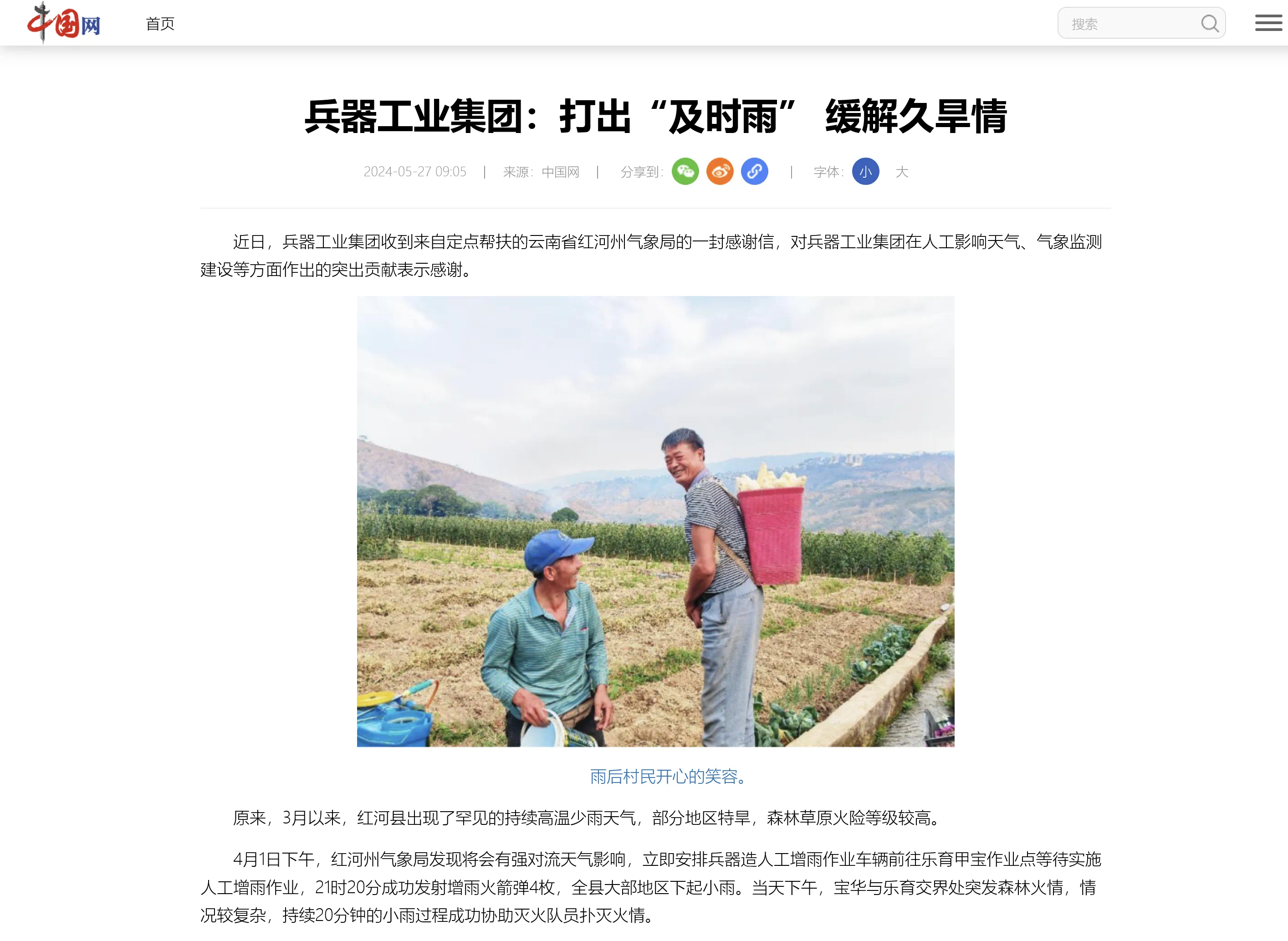 5月27日,中國網刊發(fā)《兵器工業(yè)集團:打出“及時雨” 緩解久旱情》,對中國兵器工業(yè)集團有限公司助力云南省紅河州人工影響天氣、氣象監(jiān)測建設等方面作出的突出貢獻作了報道。 兵器工業(yè)集團:打出“及時雨” 緩解久旱情 近日,兵器工業(yè)集團收到來自定點幫扶的云南省紅河州氣象局的一封感謝信,對兵器工業(yè)集團在人工影響天氣、氣象監(jiān)測建設等方面作出的突出貢獻表示感謝。 原來,3月以來,紅河縣出現(xiàn)了罕見的持續(xù)高溫少雨天氣,部分地區(qū)特旱,森林草原火險等級較高。 4月1日下午,紅河州氣象局發(fā)現(xiàn)將會有強對流天氣影響,立即安排兵器造人工增雨作業(yè)車輛前往樂育甲寶作業(yè)點等待實施人工增雨作業(yè),21時20分成功發(fā)射增雨火箭彈4枚,全縣大部地區(qū)下起小雨。當天下午,寶華與樂育交界處突發(fā)森林火情,情況較復雜,持續(xù)20分鐘的小雨過程成功協(xié)助滅火隊員撲滅火情。