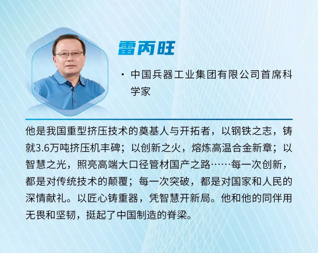 近日,《科學(xué)中國人》雜志社發(fā)布2024“年度科技人物”榜單,中國兵器首席科學(xué)家、北重集團(tuán)雷丙旺當(dāng)選“影響力科學(xué)家”。   雷丙旺是我國極端金屬擠壓技術(shù)的開拓者,扎根邊疆地區(qū)國防特大型企業(yè)工作38年,長期從事金屬成形制造裝備與工藝研究工作。他研制出我國極限制造的大國重器——3.6萬噸黑色金屬垂直擠壓機(jī),一舉打破國外技術(shù)封鎖,填補(bǔ)國內(nèi)空白,實現(xiàn)了超(超)臨界電站核心管道和航空發(fā)動機(jī)高壓渦輪盤粉末合金棒材的中國制造,開發(fā)出成套關(guān)鍵技術(shù),取得一系列原創(chuàng)性成果,促進(jìn)了產(chǎn)業(yè)的融合發(fā)展,創(chuàng)造巨大經(jīng)濟(jì)社會效益。