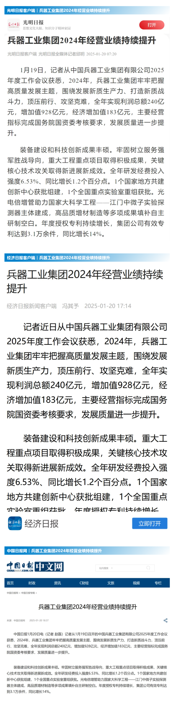 1月19日至20日,中國兵器工業(yè)集團(tuán)有限公司2025年度工作會(huì)議在京召開,會(huì)議總結(jié)2024年工作,分析形勢任務(wù),明確工作思路,部署2025年工作。 集團(tuán)公司2024年取得的成績及下一步重點(diǎn)工作受到社會(huì)媒體廣泛關(guān)注。新華社、中國新聞網(wǎng)、中國科技網(wǎng)、光明日?qǐng)?bào)客戶端、經(jīng)濟(jì)日?qǐng)?bào)客戶端、中國日?qǐng)?bào)網(wǎng)、國務(wù)院國資委網(wǎng)站、學(xué)習(xí)強(qiáng)國中央企業(yè)學(xué)習(xí)平臺(tái)、新浪網(wǎng)、網(wǎng)易網(wǎng)、搜狐網(wǎng)、騰訊網(wǎng)、鳳凰網(wǎng)等中央主流媒體、國家部委網(wǎng)站及知名網(wǎng)絡(luò)媒體對(duì)集團(tuán)公司2025年度工作會(huì)議進(jìn)行了報(bào)道,重點(diǎn)關(guān)注集團(tuán)公司經(jīng)營業(yè)績、科技創(chuàng)新、產(chǎn)業(yè)結(jié)構(gòu)布局優(yōu)化等情況。其中,新華社以《我國實(shí)現(xiàn)50至360噸無人礦車全譜系產(chǎn)業(yè)化》為題,重點(diǎn)報(bào)道了集團(tuán)公司在推動(dòng)智能制造水平提升方面取得的成效;中國新聞網(wǎng)、光明日?qǐng)?bào)客戶端、經(jīng)濟(jì)日?qǐng)?bào)客戶端、中國日?qǐng)?bào)網(wǎng)等就集團(tuán)公司2024年度經(jīng)營業(yè)績及各項(xiàng)工作取得的成果進(jìn)行報(bào)道;中國科技網(wǎng)著重報(bào)道了集團(tuán)公司在科技創(chuàng)新和優(yōu)化產(chǎn)業(yè)結(jié)構(gòu)布局方面的最新進(jìn)展。集團(tuán)公司門戶網(wǎng)站、微信公眾號(hào)、微博等新媒體平臺(tái)以及《中國兵工報(bào)》也對(duì)集團(tuán)公司工作會(huì)議進(jìn)行了及時(shí)報(bào)道,各成員單位紛紛對(duì)相關(guān)內(nèi)容進(jìn)行轉(zhuǎn)載,引發(fā)全系統(tǒng)關(guān)注。 集團(tuán)公司職工及廣大網(wǎng)友熱議工作會(huì) “2025年工作會(huì)為我們指明了發(fā)展方向、明確了奮斗目標(biāo),面對(duì)全新的機(jī)遇和挑戰(zhàn),作為兵工人深感責(zé)任重大?!?/p> “科技是第一生產(chǎn)力,一定要以科技創(chuàng)新引領(lǐng)新質(zhì)生產(chǎn)力發(fā)展,為高質(zhì)量發(fā)展提供支撐?!?/p> “把各項(xiàng)工作做深、做實(shí)、做細(xì),努力為集團(tuán)公司高質(zhì)量發(fā)展添磚加瓦?!?/p> “2024年中國兵器展示了大國重器,祝新的一年中再創(chuàng)輝煌!” |