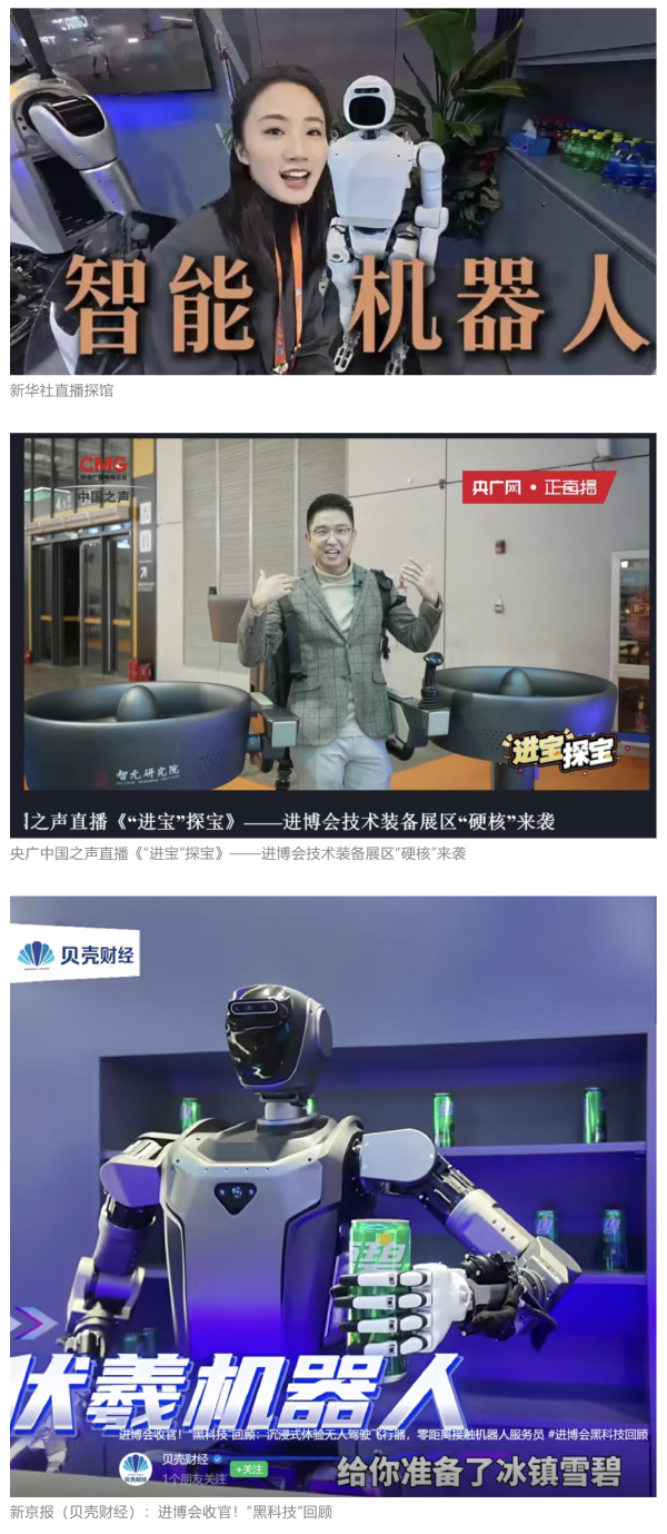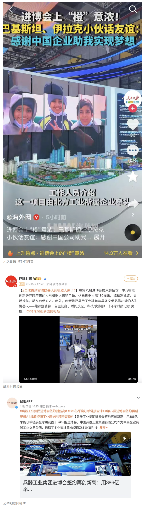 11月5日至10日,中國兵器工業(yè)集團有限公司組團參加第八屆中國國際進口博覽會。集團公司以“堅持合作共贏,推進高水平對外開放,助力構(gòu)建新發(fā)展格局”為目標(biāo),圍繞“新征程,共創(chuàng)未來”主題組團參展,集中展示了一系列新技術(shù)、新理念、新成果,取得豐碩成果,受到廣泛關(guān)注。 嘉賓云集 本屆進博會上,蒙古國駐華大使、贊比亞礦業(yè)和礦產(chǎn)開發(fā)部常任秘書、津巴布韋首席司長等多國政要蒞臨集團公司組展展區(qū),了解有關(guān)項目情況。 國家能源集團、東風(fēng)汽車、哈電集團、鞍鋼集團、中鋁集團、通用技術(shù)集團、中國中車、中國長安汽車、中國電建等央企領(lǐng)導(dǎo),工信部、國務(wù)院國資委、中國貿(mào)促會、陜西省、上海市、浙江省等國內(nèi)政府部門領(lǐng)導(dǎo)以及國內(nèi)外合作伙伴蒞臨集團公司組展展區(qū)參觀指導(dǎo)。對集團公司高質(zhì)量共建“一帶一路”,與各國合作伙伴共享發(fā)展機遇、實現(xiàn)互利共贏給予高度評價。 媒體關(guān)注 集團公司集中簽約亮相央視綜合頻道《新聞聯(lián)播》、央視新聞頻道《朝聞天下》《新聞30分》《共同關(guān)注》、央視財經(jīng)頻道《正點財經(jīng)》《經(jīng)濟信息聯(lián)播》。 《環(huán)球時報》、環(huán)球網(wǎng)、《新京報》、《中國旅游報》等對集團公司人形機器人、四足機器人、涵道穿戴式載人飛行器、外骨骼等多型新域新質(zhì)產(chǎn)品,集中亮相進行報道。新華社、央廣中國之聲、新京報(貝殼財經(jīng))、上海廣播電視臺等媒體直播探館,打卡兵器“硬核科技”。 人民日報客戶端、新華社客戶端、人民網(wǎng)、中國網(wǎng)、中國日報網(wǎng)、國務(wù)院國資委網(wǎng)站、國資小新微信公眾號、國資小新Facebook、學(xué)習(xí)強國中央企業(yè)學(xué)習(xí)平臺、經(jīng)濟觀察網(wǎng)、新京報客戶端等第一時間刊發(fā)集團公司組展簽約、ESG建設(shè)等情況。新浪財經(jīng)、界面新聞等商業(yè)平臺閱讀量累計超500萬次。 在微博、抖音等新媒體平臺上,集團公司高科技產(chǎn)品演示、5D穹幕電影體驗等短視頻持續(xù)引爆流量,累計播放量超800萬次,點贊量破50萬?!氨鞴I(yè)集團進博會簽約386億”相關(guān)話題登上微博熱搜榜,閱讀量破5000萬次。 文字丨劉暢 |